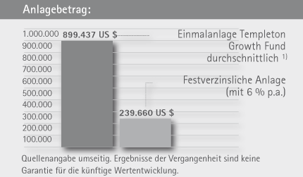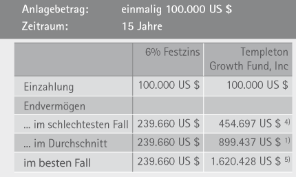 Angenommen Sie hätten einmalig 100.000 US$ angelegt, beispielsweise Geld aus einer Erbschaft, aus einer ausbezahlten Lebensversicherung oder ganz einfach aus den Ersparnissen Ihrer Arbeit. Dann beträgt die Differenz zwischen einer garantierten Festzins-Anlage bei der Bank und einer Anlage in den von uns seit Jahren empfohlenen Templeton Growth Fund exakt 659.777 US$. Jeweils mit dem Durchschnittswert und über alle 15-Jahresperioden seit Gründung des Templeton Growth Fund im Jahr 1954 gerechnet.