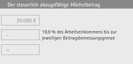 Von dem steuerlich abzugsfähigen Höchstbetrag von 20.000 € pro Person muss der Beitrag zur gesetzlichen Rentenversicherung abgezogen werden, um den maximalen Jahresbeitrag für die Basis-Rente zu ermitteln.