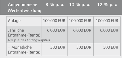 Angenommen, Sie legen 100.000 Euro an und entnehmen eine monatliche "Zusatzrente" in Höhe von 500 Euro. Wie entwickelt sich Ihr Kapital bei einer Wertentwicklung von 8, 10 oder 12 % p.a.?