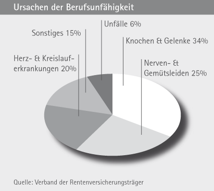 Jeder fünfte Angestellte und jeder dritte Arbeiter scheidet heute vor Erreichen der Altersgrenze aus dem Berufsleben aus, weil er berufs- oder erwerbsunfähig wird. Stress, Hektik und der ständig steigende Leistungsdruck erhöhen das Risiko von Krankheiten und Unfällen, die zu einer vorzeitigen Aufgabe der Erwerbstätigkeit nötigen.