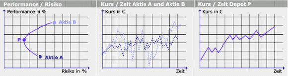 Die nachfolgenden Abbildungen illustrieren die positive Folge dieses Zusammenhangs: Diversifikation führt zur Risikominimierung. Dargestellt sind Risiko und Renditeerwartung der Aktie A, der Aktie B und eines Depots, das aus den Aktien A und B zusammengesetzt ist. |