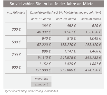 Zudem werden die Mieten durchschnittlich um 2 bis 3 Prozent pro Jahr erhöht. Eine Wohnung, für die Sie heute 500 Euro zahlen, wird dann bei nur 2-prozentiger jährlicher Mietsteigerung in 20 Jahren schon 743 Euro und bei 3 Prozent gar 903 Euro kosten.