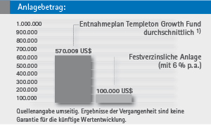 Anlagebetrag: Zeitraum: | einmalig 100.000 US$ 15 Jahre, mtl. Entnahme 500 US$ | | | | 6% Festzins | Templeton Growth Fund, Inc. | Einzahlung | 100.000 US$ | 100.000 US$ | Entnahme in 15 Jahren Verbleibende „Reserve“ nach 15 Jahren Anlagedauer | 90.000 US$ | 90.000 US$ | | | | Endvermögen